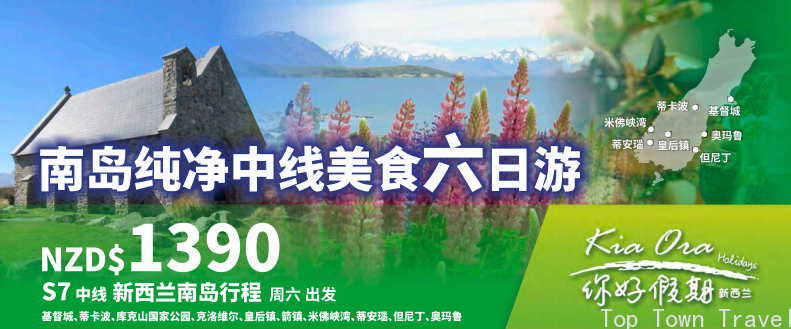 早餐后, 在蒂卡波湖畔自由活动。美丽的蒂卡波湖,因湖底特有的青绿色岩石,整个湖面呈现一种翠绿迷蒙的梦幻景象。雪山环绕,山景湖景交相辉映。随后专车返回基督城,结束这梦幻般的南岛之旅!